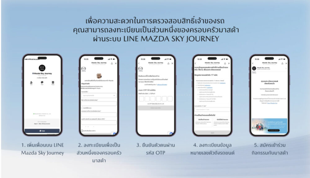 หมายเหตุ: เพื่อความสะดวกในการตรวจสอบสิทธิ์เจ้าของรถ ลูกค้าสามารถลงทะเบียนผ่านระบบไลน์ MAZDA SKY JOURNEY