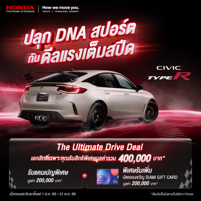 บริษัท ฮอนด้า ออโตโมบิล (ประเทศไทย) จำกัด ส่งดีลแรงเต็มสปีด เอาใจแแฟน ๆ สายสปอร์ตกับแคมเปญ “The Ultimate Drive Deal” ให้คุณเป็นเจ้าของ ฮอนด้า ซีวิค ไทป์ อาร์ (Civic Type R) ที่สุดแห่งยนตรกรรมความสปอร์ต กับข้อเสนอสุดพิเศษรวมมูลค่า 400,000 บาท เมื่อจองและรับรถระหว่างวันที่ 1 สิงหาคม 2568 – 31 ตุลาคม 2568