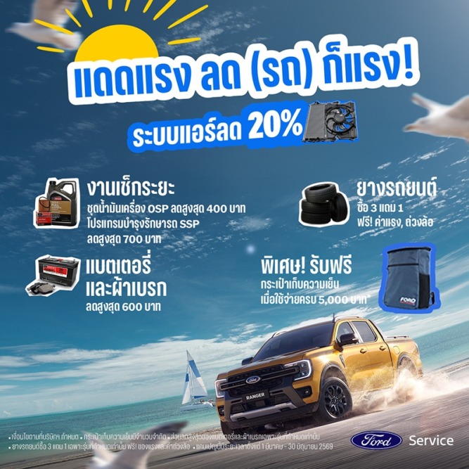 ฟอร์ด ประเทศไทย มอบความมั่นใจและความปลอดภัยในช่วงเทศกาลวันหยุดฤดูร้อนที่ลูกค้ารถฟอร์ดต้องเดินทางไกล จัดแคมเปญบริการหลังการขายสุดพิเศษ ‘แดดแรง ลด(รถ) ก็แรง’ ชวนลูกค้านำรถเข้าตรวจสภาพให้พร้อมสู้ลมร้อน ด้วยข้อเสนอสุดคุ้ม อาทิ ส่วนลดอะไหล่ระบบแอร์ 20% ส่วนลดแพ็กเกจเช็กระยะสูงสุด 700 บาท โปรโมชันยาง 3 แถม 1 และรับฟรี กระเป๋าเก็บความเย็น ตั้งแต่วันที่ 1 มีนาคม – 30 มิถุนายน 2569 ที่ศูนย์บริการฟอร์ดทั่วประเทศ