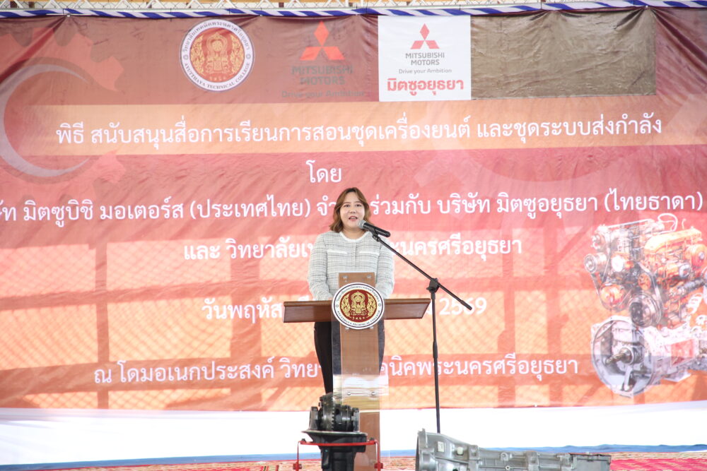นางสาวมยุรี ศรีระบุตร ผู้อำนวยการวิทยาลัยเทคนิคพระนครศรีอยุธยา รักษาราชการแทนผู้อำนวยการสถาบันการอาชีวศึกษาภาคกลาง 1 กล่าวว่า “เราขอขอบคุณ มิตซูบิชิ มอเตอร์ส ประเทศไทย และผู้จำหน่าย บริษัท มิตซูอยุธยา (ไทยธาดา) จำกัด สำหรับการสนับสนุนเครื่องยนต์และชุดส่งกำลัง ซึ่งนับเป็นสื่อการเรียนการสอนที่มีคุณค่าต่อการพัฒนาทักษะของนักศึกษา พร้อมทั้งการฝึกอบรมเชิงปฏิบัติจากช่างเทคนิคที่ชำนาญการ และการเรียนรู้เทคโนโลยีใหม่ล่าสุด จะช่วยเพิ่มพูนประสบการณ์การเรียน การสอนให้มีประสิทธิภาพมากยิ่งขึ้น สอดคล้องกับแนวทางการผลิตบุคลากรคุณภาพเพื่อตอบโจทย์ความต้องการในภาคอุตสาหกรรม และเพิ่มโอกาสให้นักศึกษาได้พัฒนาตนเองสู่ความเป็นมืออาชีพอย่างแท้จริง”