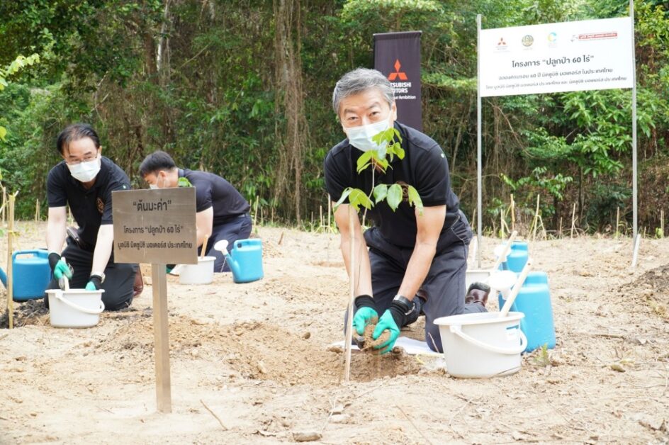 บริษัท มิตซูบิชิ มอเตอร์ส (ประเทศไทย) จำกัด และมูลนิธิ มิตซูบิชิ มอเตอร์ส ประเทศไทย จัดกิจกรรมปลูกป่า จำนวน 20 ไร่ ณ ป่าชุมชนบ้านอ่างกระพงศ์ อำเภอ บ่อทอง จังหวัด ชลบุรี นำโดย มร. โมะริคาซุ ชกกิ (ที่ 5 จากขวา) ประธานคณะกรรมการบริษัทฯ และ ประธาน มูลนิธิฯ โดยได้รับเกียรติจาก  นายเกียรติชาย ไมตรีวงษ์ (ที่ 3 จากขวา) ผู้อำนวยการ องค์การบริหารจัดการก๊าซเรือนกระจก (องค์การมหาชน) ว่าที่ร้อยตรี ศราวุธ กรจิระเจริญ (ที่ 2 จากขวา) นายอำเภอบ่อทอง และนายอูฐ เชาวน์ทวี (ที่ 4 จากขวา) ผู้แทน  กรมป่าไม้ ได้เข้าร่วมปลูกป่าในครั้งนี้ด้วย โดยกิจกรรมดังกล่าวเป็นส่วนหนึ่งของโครงการ “ปลูกป่า 60 ไร่” เพื่อแสดงเจตจำนงของการเป็นส่วนหนึ่งของสังคมที่ให้ความสำคัญและใส่ใจกับการสร้างสิ่งแวดล้อมที่ดีให้แก่ประเทศ ควบคู่ไปกับการสร้างสรรค์และพัฒนาประเทศให้เติบโตอย่างยั่งยืนตลอดระยะเวลา 60 ปี ของการดำเนินธุรกิจของมิตซูบิชิ มอเตอร์ส ในประเทศไทย