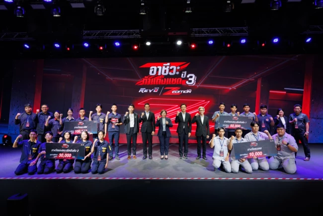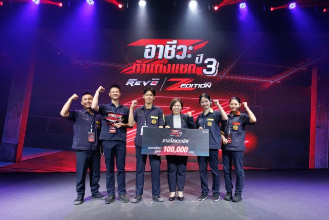 นายณัทธร ศรีนิเวศน์ ผู้ช่วยกรรมการผู้จัดการใหญ่ บริษัท โตโยต้า มอเตอร์ ประเทศไทย จำกัด พร้อมด้วย นางเบญจวรรณ ปกป้อง ผู้อำนวยการสำนักความร่วมมือ สำนักงานคณะกรรมการการอาชีวศึกษา กระทรวงศึกษาธิการ นายศุภชัย แพร่พิพัฒน์มงคล ประธานชมรมผู้แทนจำหน่ายฯ เขตภาคตะวันออก ร่วมมอบรางวัลผู้ชนะการประกวดแต่งรถกระบะไฮลักซ์ รีโว่ แซด อิดิชั่น ภายใต้กิจกรรม “อาชีวะ ท้าแต่งแซด กับ ไฮลักซ์ รีโว่ แซด อิดิชั่น ปี 3” เมื่อวันที่ 11 มีนาคม 2569 ณ TOYOTA ALIVE บางนา กม.3