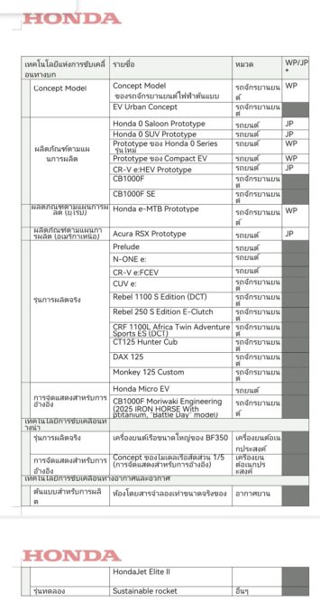 <รายชื่อผลิตภัณฑ์และเทคโนโลยีต่าง ๆ ของฮอนด้าที่จะนำมาจัดแสดงภายในงาน>