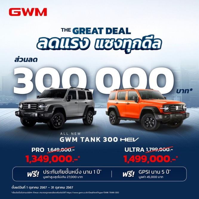 เกรท วอลล์ มอเตอร์ (ประเทศไทย) หนึ่งในผู้นำรถยนต์พลังงานใหม่ของไทย เดินหน้ามอบข้อเสนอสุดพิเศษ เพื่อส่งมอบรถยนต์พลังงานใหม่ที่เปี่ยมไปด้วยเทคโนโลยีและนวัตกรรมสุดล้ำพร้อมตอบโจทย์การใช้งานที่หลากหลายของชาวไทย ส่งส่วนลดและสิทธิประโยชน์สุดคุ้มค่าให้ลูกค้าได้เป็นเจ้าของรถยนต์พลังงานใหม่ได้อย่างง่ายดายมากยิ่งขึ้นตลอดทั้งเดือนตุลาคมนี้ นำทัพด้วย GWM TANK และ GWM ORA 07 ที่มาพร้อมดีลส่วนลดสูงสุดถึง 300,000 บาท ตามมาด้วย GWM ORA Good Cat และ GWM HAVAL ที่สร้างความคึกคักให้กับตลาดรถยนต์ไทยเมื่อเดือนที่ผ่านมา กับสิทธิประโยชน์มูลค่าสูงสุดรวมกว่า 500,000 บาท เพื่อเร่งเครื่องในไตรมาสสุดท้ายของปี ห้ามพลาด! ตั้งแต่ 1 – 31 ตุลาคม 2567 นี้ ที่ GWM Application หรือเว็บไซต์ https://www.gwm.co.th และ พาร์ทเนอร์ สโตร์ ของ เกรท วอลล์ มอเตอร์ ทุกสาขาทั่วประเทศไทย