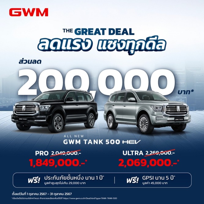 - ALL NEW GWM TANK 500 HEV รุ่น ULTRA จากราคา 2,269,000 บาท เหลือเพียง 2,069,000 บาท