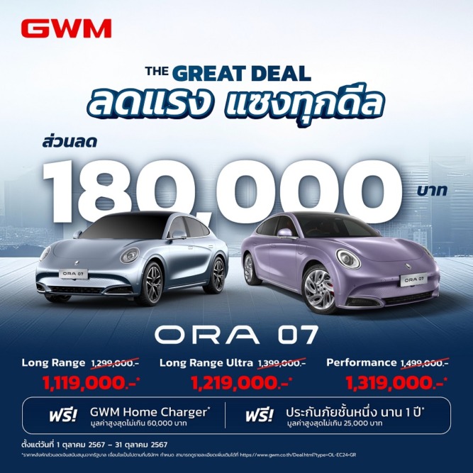 - GWM ORA 07 รุ่น LONG RANGE ULTRA จากราคา 1,399,000 บาท เหลือเพียง 1,219,000 บาท