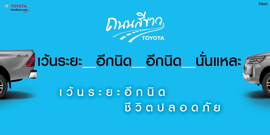 โตโยต้าขอเชิญชวนทุกคนมีส่วนร่วมในการรณรงค์และประชาสัมพันธ์ การเว้นระยะห่างในการขับขี่ “เว้นระยะอีกนิด ชีวิตปลอดภัย” ให้ทุกคนเดินทางอย่างปลอดภัยในช่วงวันหยุด เพื่อส่งมอบความสุขและสร้างรอยยิ้มให้แก่คนไทยทุกคน