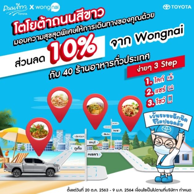 “เว้นระยะอีกนิด ชีวิตปลอดภัย” มุ่งเน้นให้ผู้ใช้รถใช้ถนนเว้นระยะห่างในการขับขี่อย่างเหมาะสม เพื่อลดอัตราการเกิดอุบัติเหตุในการเดินทางช่วงเทศกาล พร้อมส่งมอบความสุขให้กับผู้ใช้รถใช้ถนนทุกท่านโดยร่วมกับ แอปพลิเคชันวงใน (Wongnai) มอบส่วนลดสุดพิเศษจากร้านอาหารชื่อดังกว่า 40 แห่งทั่วประเทศ ให้ผู้เดินทางท่องเที่ยวมีความสุขตลอดเส้นทาง
