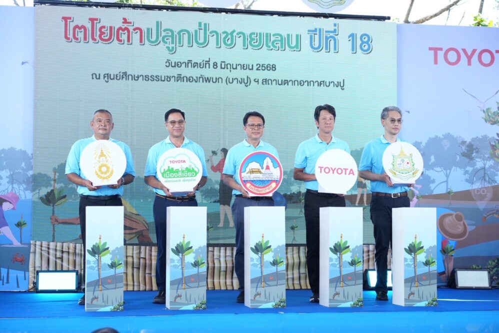 นายธีรพล ศรีโมรา ผู้อำนวยการสำนักงานทรัพยากรธรรมชาติและสิ่งแวดล้อมจังหวัดสมุทรปราการ พลตรี ยุทธนา ธรรมธร เสนาธิการกรมพลาธิการทหารบก พลโท จินตมัย ชีกว้าง เจ้ากรมกิจการพลเรือนทหารบก คุณกลินท์ สารสิน ประธานคณะกรรมการ และมร.โนริอากิ ยามาชิตะ กรรมการผู้จัดการใหญ่บริษัท โตโยต้า มอเตอร์ ประเทศไทย จำกัด พร้อมด้วยผู้บริหารระดับสูง ผู้ผลิตชิ้นส่วนโตโยต้า ผู้แทนจำหน่ายโตโยต้า ลูกค้า ตลอดจนหน่วยงานพันธมิตร ทั้งภาครัฐ ภาคเอกชน และประชาชน ร่วมปลูกป่าชายเลนจำนวน 50,000 ต้น เพื่อมุ่งสู่เป้าหมายความเป็นกลางทางคาร์บอนอย่างยั่งยืน ผ่านกิจกรรม “โตโยต้าปลูกป่าชายเลน ปีที่ 18” ณ สถานตากอากาศบางปู จังหวัดสมุทรปราการ เมื่อวันที่ 8 มิถุนายน 2568