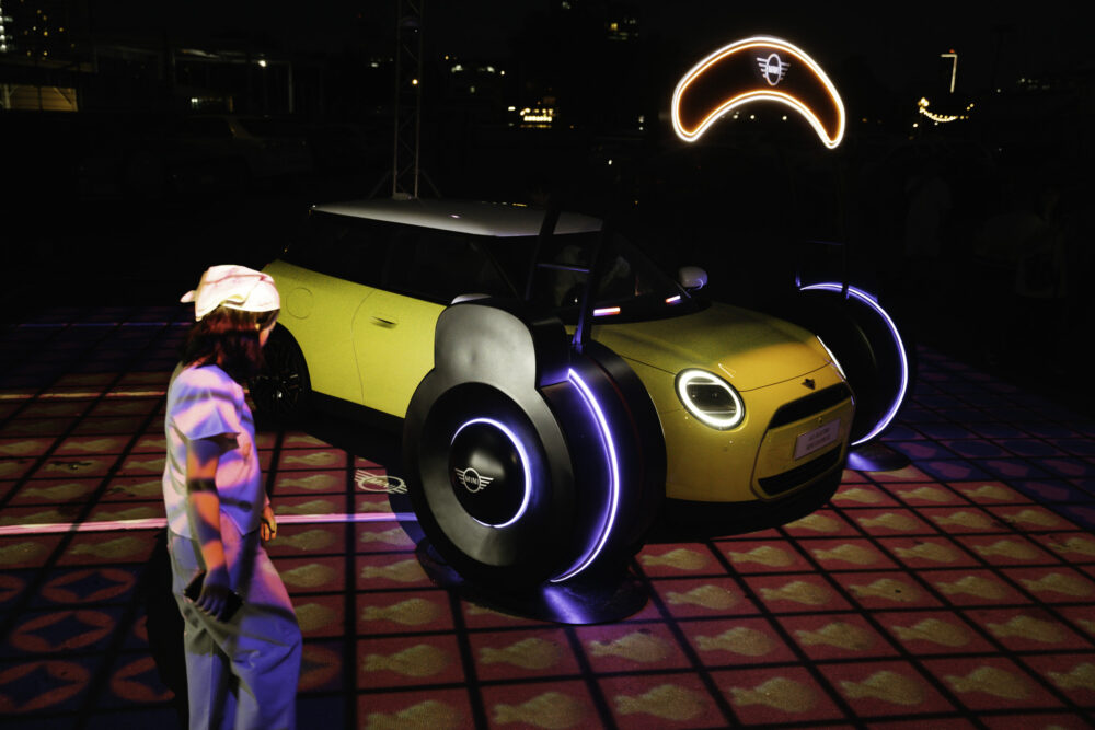 ภายในลานจอดรถช้างถูกเปลี่ยนโฉมเป็นพื้นที่ให้ทุกคนได้สัมผัสกับค่ำคืนที่ส่องประกายในธีม “Electrify the Night” ที่จะเชื่อมต่อตัวเองกับผู้คนรอบข้าง ผ่านแสง สี เสียง และการเคลื่อนไหว ปลุกทุกจังหวะความสนุก ด้วยโหมดการขับขี่ที่หลากหลายจาก มินิ ผู้เข้าชมจะได้พบกับไฮไลท์สำคัญคือ มินิ คูเปอร์ เอสอี ในสีเหลือง Sunny Side Yellow สดใสที่ถูกห้อมล้อมด้วยหูฟังเรืองแสงดีไซน์สุดเก๋ และดื่มด่ำกับการแสดงแสงสีที่ได้รับแรงบันดาลใจจาก Experience Mode ทั้ง 7 โหมดของมินิ ไม่ว่าจะเป็นแสงที่ให้ฟีลลิ่งสนุกสดใส คึกคัก อบอุ่น หรือแสงที่ผ่อนคลาย เหมือนกับจังหวะของย่านทรงวาด ที่เปลี่ยนไปตามชีพจรของผู้คน เศรษฐกิจ และวัฒนธรรม ที่ไม่เคยหยุดนิ่ง ผสานไปกับการฉายภาพศิลปะแบบ projection mapping บนพื้นที่เคลื่อนไหวไปตามไดนามิกของเพลง ซึ่งสามารถปรับเปลี่ยนบรรยากาศศิลปะได้ตามโหมดต่าง ๆ ของมินิทั้ง 7 โหมด ไม่ว่าจะเป็น Core Mode, Go-Kart Mode, หรือ Personal Mode