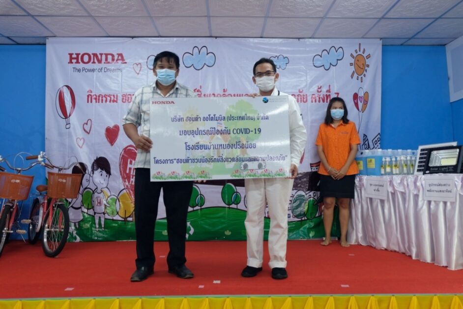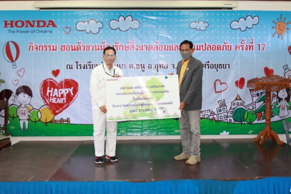 ส่งมอบพื้นที่ที่ได้รับการปรับปรุงภูมิทัศน์และพัฒนาสิ่งแวดล้อมใน “Honda Dream School โครงการโรงเรียนสร้างสรรค์สิ่งแวดล้อมและความปลอดภัยกับฮอนด้า” ปีที่ 17 รวมทั้งมอบสื่อการเรียนการสอนและอุปกรณ์ป้องกันโควิด-19 ให้แก่โรงเรียนวัดสะแก โดยมี นายสมยศ ขอพร (ขวา) นายกองค์การบริหารส่วนตำบลธนู จ.พระนครศรีอยุธยา เป็นผู้รับมอบ