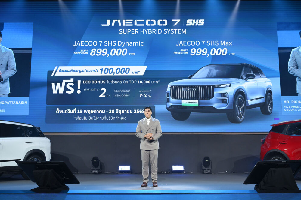 JAECOO 7 SHS มากับข้อเสนอพิเศษ ECO BONUS รับส่วนลด On Top 10,000 บาท เพียงคุณเป็นเจ้าของรถ เครื่องยนต์สันดาป (ICE) หรือ ไฮบริด (Hybrid), ฟรี! ค่าบำรุงรักษาเป็นระยะเวลา 2 ปี, ฟรี! Home Charger พร้อมติดตั้ง, ฟรี! สายชาร์จ V-2-L และข้อเสนออื่นๆอีกมากมาย เมื่อจองและออกรถตั้งแต่ 15 พฤษภาคม – 30 มิถุนายน 2568 เท่านั้น
