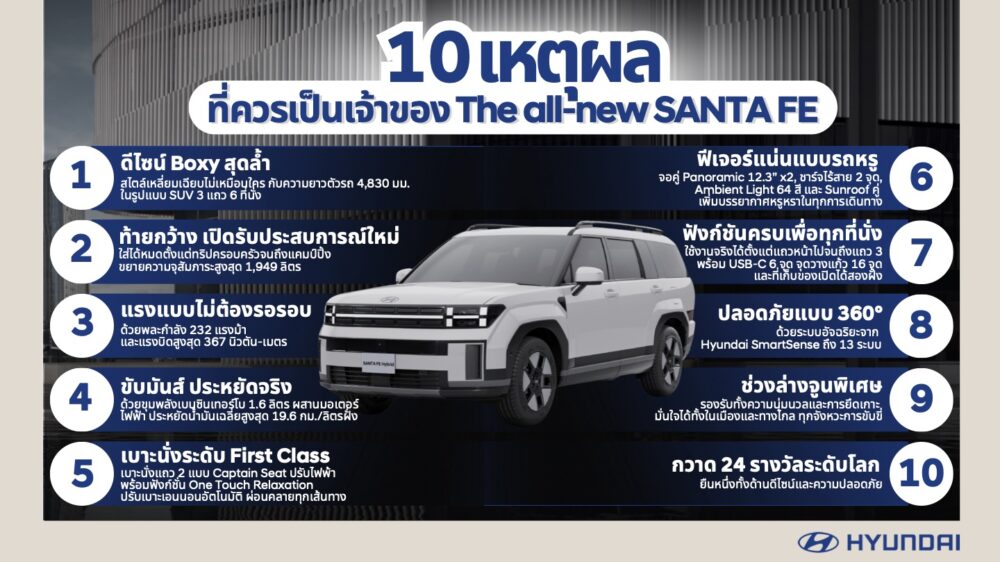 บริษัท ฮุนได โมบิลิตี้ (ประเทศไทย) จำกัด สร้างปรากฏการณ์เขย่าตลาด SUV ไทย ด้วยการส่ง The all-new SANTA FE ยนตรกรรม SUV ไฮบริดระดับเรือธง 3 แถว 6 ที่นั่ง ที่รวมทุกความต้องการไว้ในคันเดียวอย่างไร้ข้อจำกัด ไม่ว่าจะเป็นดีไซน์ทรงเหลี่ยมแบบ Boxy สุดล้ำ ภายในห้องโดยสารหรูหรา พื้นที่เก็บสัมภาระท้ายที่กว้างขวาง พร้อมขยายพื้นที่เพื่อเปิดรับประสบการณ์ใหม่ ๆ มาพร้อมฟังก์ชันล้ำสมัย ความปลอดภัยครบครัน และสมรรถนะเหนือระดับ สมรรถนะทรงพลัง เทคโนโลยีจัดเต็ม และความคุ้มค่าแบบที่ “ให้เกินราคา” พร้อมเผยอินไซต์ 10 เหตุผลเด็ด! ที่ทำให้ The all-new SANTA FE กลายเป็นตัวเลือกที่ต้องมีในลิสต์ของผู้บริโภคยุคใหม่ ตอกย้ำสโลแกน “Open for More Horizons” มากกว่าเส้นขอบฟ้า คือ คำว่าอิสระ ให้ The all-new SANTA FE เป็นส่วนหนึ่งในการเปิดประสบการณ์ใหม่ ๆ ไร้ขีดจำกัดสำหรับคุณ