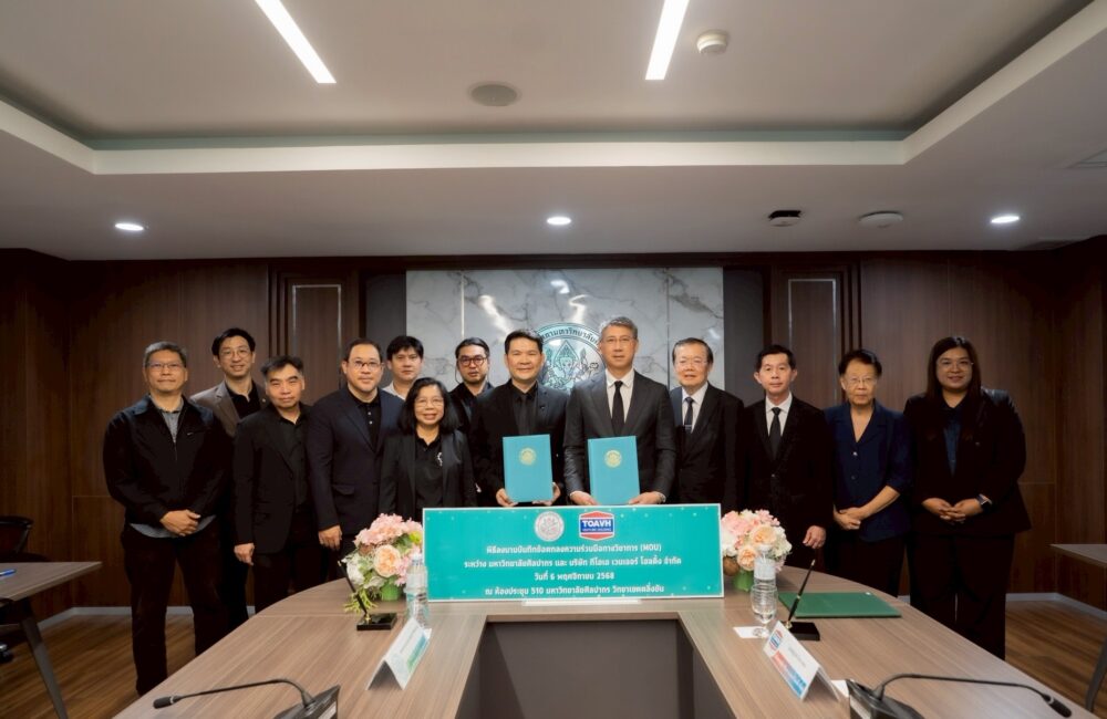 พิธีลงนามจัดขึ้น ณ ห้องประชุม มหาวิทยาลัยศิลปากร วิทยาเขตตลิ่งชัน โดยมี นายณัฏฐวุฒิ ตั้งคารวคุณ (ที่ 3 จากขวา) ประธาน, นายพิศิษฐ์ บุญจรรยา (ที่ 2 จากขวา) กรรมการ และนายเทอดศักดิ์ สุรกิจบวร (ที่ 1 จากขวา) กรรมการ กลุ่มบริษัท ทีโอเอ เวนเจอร์ โฮลดิ้ง ร่วมลงนามกับ ศาสตราจารย์ ดร.ธนะเศรษฐ์ ง้าวหิรัญพัฒน์ (ที่ 3 จากซ้าย) อธิการบดี, ผู้ช่วยศาสตราจารย์ ดร.อรุณศรี ลีจีรจำเนียร (ที่ 2 จากซ้าย) คณบดี คณะวิศวกรรมศาสตร์และเทคโนโลยีอุตสาหกรรม และ รองศาสตราจารย์ อาวิน อินทรังษี (ที่ 1 จากซ้าย) คณบดี คณะมัณฑนศิลป์ มหาวิทยาลัยศิลปากร พร้อมด้วยคณะผู้บริหารและคณาจารย์จากทั้งสองฝ่ายร่วมเป็นสักขีพยานในพิธีดังกล่าว