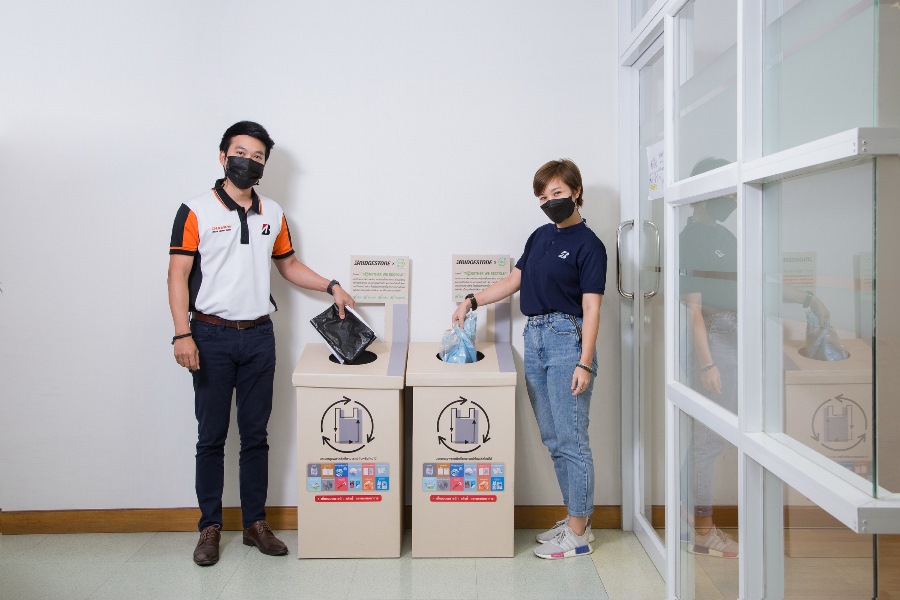 - พนักงานบริดจสโตน ประเทศไทย ร่วมมือกันคัดแยกขยะรีไซเคิลประเภท “พลาสติกใช้ครั้งเดียวแล้วทิ้ง” ส่งมอบให้โครงการ “วน” นำไปผลิตใหม่เป็นถุงสำหรับใส่ขยะ และนำกลับมาใช้ในองค์กรอีกครั้ง