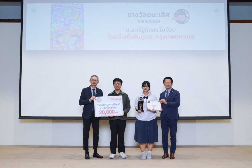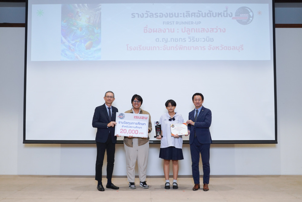 น.ส. ณัฐภัสสร ใยย้อย โรงเรียนโยธินบูรณะ จังหวัดกรุงเทพมหานคร รางวัลชนะเลิศระดับชั้นมัธยมศึกษาตอนต้น เล่าถึงแรงบันดาลใจว่า “แรงบันดาลใจของหนูนะคะ เนื่องจากโจทย์เกี่ยวกับเพื่อนที่เราไว้ใจที่สุด แล้วการแข่งขันนี้เป็นการแข่งขันวาดภาพ เพื่อนของหนูก็คือศิลปะนี่แหละค่ะ เพราะว่าหนูรักการวาดรูปมาตลอด หนูเลยเลือกศิลปะเป็นแรงบันดาลใจที่สำคัญที่สุดในการสร้างสรรค์ผลงาน หนูคิดว่าหัวข้อนี้ก็มีทั้งความยากและง่าย เราต้องตีความออกมาในรูปแบบของเรา คำว่าเพื่อนที่เราไว้ใจที่สุด แล้วก็มีคุณค่าสำหรับเราก็ไม่เหมือนกันแต่สำหรับหนูก็คือศิลปะ ก็อยากจะเชิญชวนเพื่อนๆ ทุกคนนะคะ มาร่วมสร้างผลงานกับอีซูซุนะคะ จะได้เป็นประสบการณ์ที่ดีอีกอย่างหนึ่งค่ะ แล้วก็จะได้พบปะพูดคุยกับเพื่อนใหม่ ๆ ด้วยค่ะ”